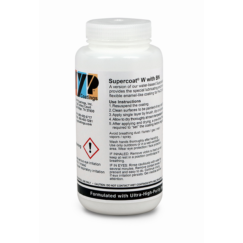 Supercoat® W with BN has all the properties of water-based Supercoat W but has Boron Nitride added to provide all of its special lubricating and non-wetting properties. The coating is ideal for application onto Fe-Cr-Ni metal surfaces. After applying and drying, Supercoat W with BN also requires a one-time “bake-on” to 800-850 C. after which a well-bonded tough/flexible, electrically insulating coating results.